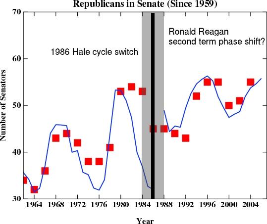 If we now put it all together, we can see that there is a reasonable match over the whole period…. well, except that break in the period 1984 and 1988 and, unfortunately, last year’s elections didn’t fit the pattern either. But 1984-1988 was Ronald Reagan’s second term and clearly no theory of Republican senators can ignore that. We therefore propose that the ‘Ronald Reagan second term phase shift’ combined with the change of sign of the Hale solar magnetic cycle in 1986, obviously changed the dynamics. This kind of phase shift is frequently seen in solar studies (cf. Landscheidt and many others), where it is rarely taken as a sign that two time series with decadal spectral power are in fact completely independent. Finally, it is permissible to leave off the more recent data points (cf. TGGWS) for “graphical convenience”. So after just a little work, we have managed to rescue the original theory to match a much longer amount of data: