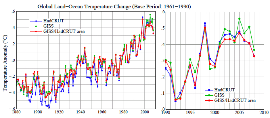 Figure 4. Global surface temperature anomalies relative to 1961‐1990 base period for three cases: HadCRUT, GISS, and GISS anomalies limited to the HadCRUT area. [To obtain consistent time series for the HadCRUT and GISS global means, monthly results were averaged over regions with defined temperature anomalies within four latitude zones (90N‐25N, 25N‐Equator, Equator‐25S, 25S‐90S); the global average then weights these zones by the true area of the full zones, and the annual means are based on those monthly global means.]