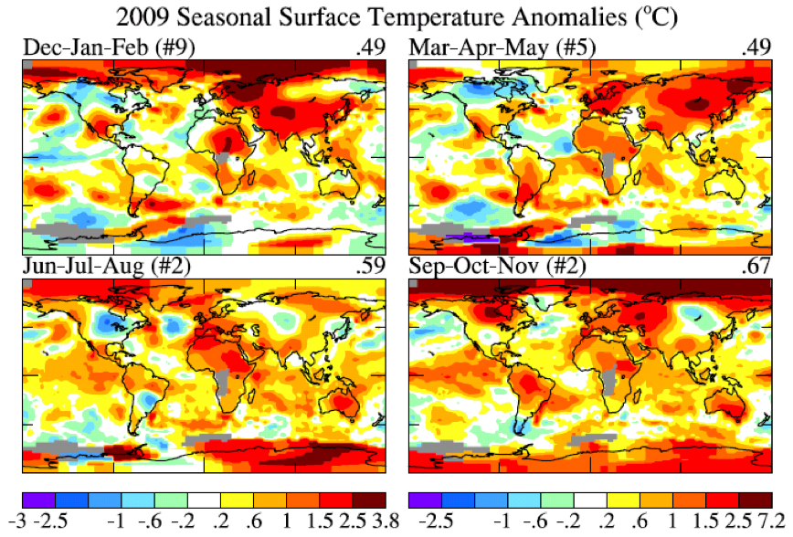 Figure 8. Global maps 4 season temperature anomalies for ~2009. (Note that Dec is December 2008. Base period is 1951‐1980.)