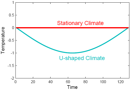 Assume there is a climate change over time that is U-shaped, like the blue temperature curve shown in Fig. 1. Perhaps a solar cycle might have driven that initial cooling and then warming again – or we might just be looking at part of a seasonal cycle around winter. (In fact what is shown is the lower half of a sinusoidal cycle.) For comparison, the red curve shows a stationary climate. The linear trend in both cases is the same: zero.