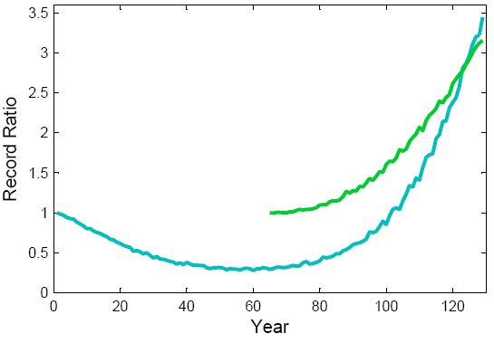 Fig. 4. The record ratio for the U-shaped climate (blue) as compared to that for a climate with an accelerating warming trend, i.e. just the second half of the U (green).