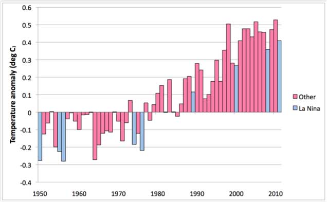 They find – pretty much in line with the Foster and Rahmstorf analysis – that La Niña conditions have made 2011 a relatively cool year – relatively, because they predict it will still rank amongst the 10 hottest years on record. They further predict it will be the warmest La Niña year on record (those are the blue years in the bar graph above).