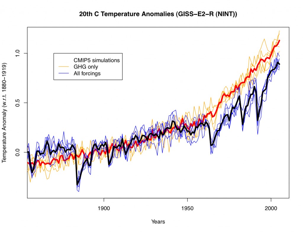 aside — has anyone used the CMIP data to chart what temperatures would have been -without- the increased use of fossil fuels (removing both the greenhouse warming and the sulfate cooling effects)? It’s worth remembering that natural variation (with or without a sunspot extended minimum) is significant.