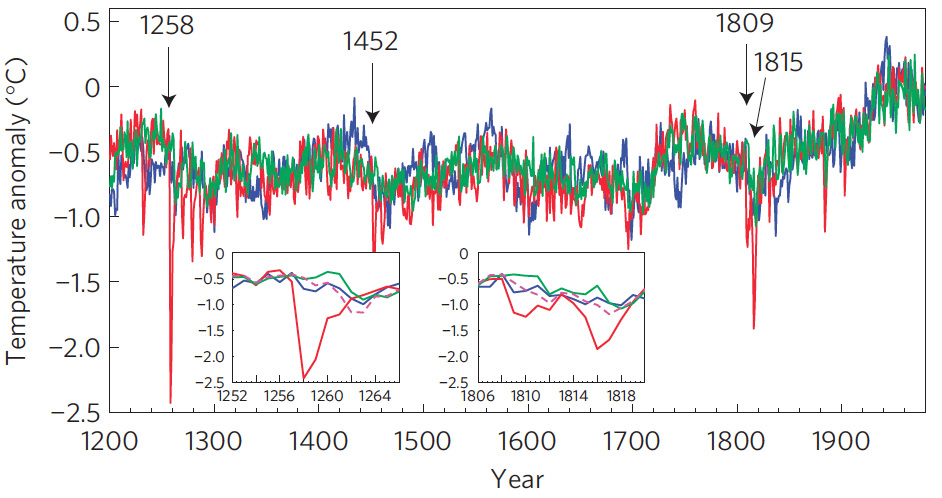 [Response: There are a number of researchers who have looked closely at the ice core data (and tephra evidence), etc. and conclude that there was a single very strong tropical eruption in AD 1258. See e.g. Stother (2000) the abstract of which reads Somewhere in the tropics, a volcano exploded violently during the year 1258, producing a massive stratospheric aerosol veil that eventually blanketed the globe. Arctic and Antarctic ice cores suggest that this was the world largest volcanic eruption of the past millenium. According to contemporary chronicles, the stratospheric dry fog possibly manifested itself in Europe as a persistently cloudy aspect of the sky and also through an apparently total darkening of the eclipsed Moon. Based on a sudden temperature drop for several months in England, the eruption’s initiation date can be inferred to have been probably January 1258. The frequent cold and rain that year led to severe crop damage and famine throughout much of Europe. Pestilence repeatedly broke out in 1258 and 1259; it occurred also in the Middle East, reportedly as plague. Another very cold winter followed in 1260-1261. The troubled period’s wars, famines, pestilences, and earthquakes appear to have contributed in part to the rise of the European flagellant movement of 1260…. But while AD 1258 is the most prominent example of the phenomenon we’re addressing in the paper, we find a very similar story for AD 1452 and AD 1809 + AD 1815 (Tambora) sequence, where we know the volcano that erupted, and there is little doubt of a large and explosive tropical eruption. In in each of these cases, the tree-rings show greatly attenuated and delayed cooling relative to what any of the climate model simulations show, using any of the published volcanic forcing estimates and differing assumptions of the optical depth/radiative forcing relationship. There doesn’t appear to be any simple way out of the conundrum. We’ve offered one hypothesis, and we argue that it yields a prediction that bears a striking relationship with the actual tree-ring reconstruction. -mike]