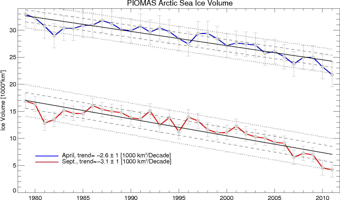 Figure 1: PIOMAS mean monthly arctic sea ice volume for April and September. Dashed lines parallel to linear fits represent one and two standard deviations from the trend. Error bars are estimated based on comparison with thickness observations and model sensitivity studies (Schweiger et al. 2011)