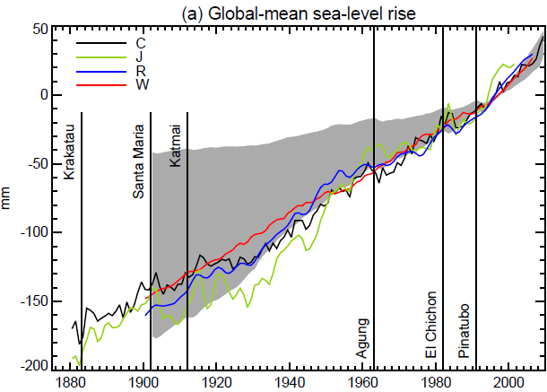 Fig. 2: Comparison of timeseries of annual-mean global-mean sea-level rise from four analyses of tide-gauge data (lines) with the range of 144 synthetic timeseries (grey shading). Each of the synthetic timeseries is the sum of a different combination of thermal expansion, glacier, Greenland ice-sheet, groundwater and reservoir timeseries. Source: Gregory et al in Journal of Climate.