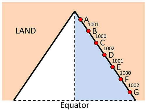 So the weights attached to these gauges differ by up to a factor of 4, apparently for no good reason. To be fair, the method was not designed to deal with regular spacing of tide gauges as in this idealised example, but with cases where spacing is highly irregular. I think it is a reasonable method e.g. to average a cluster of gauges into one number before averaging it with one far-away gauge. Nevertheless I think the example illustrates important limitations of this method, and the point that the weights by design must differ by factors of 2, 4, 8, 16… Maybe this post will inspire some mathematically-minded reader to propose a better scheme.