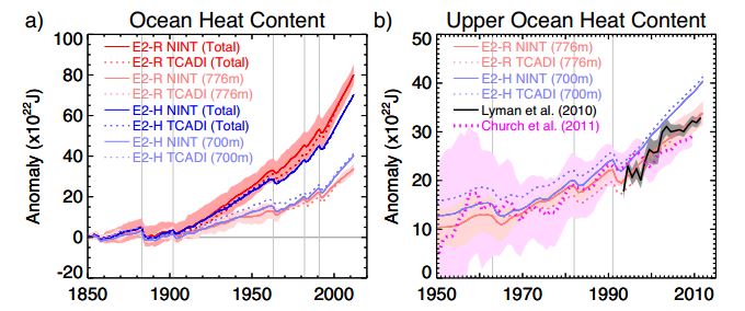 The critical point we must not forget is that an increase in GHG creates an energy flow imbalance by slowing down the rate of energy loss to space from outgoing radiation. The only way you can balance the equation is by a temperature increase to increase outgoing radiation (or by changing the atmosphere in the opposite direction). If there is a “pause” in temperature change while the oceans absorb the excess, this isn’t a good thing. We are just changing the order of events a bit because an increase in surface temperatures would in any case eventually increase the energy content of the oceans.