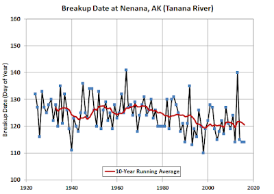 I do not know where you get the idea that we are in a cooling trend. Certainly not from anything I have said. Perhaps you are just unaware that we are discussing the Nenana Ice Classic, rather than global temperatures. In this instance, we have not witnessed 3, or 2, or even 1 record year. Indeed, the year was the 4th earliest. It was close to the 3rd, but far distant from numbers 1 and 2. While a simple, linear trend is nice to see how the break-up date has changed over history, it is rather limited in its details. A running average can be more telling, and shows that the entire trend towards earlier break-up dates occurred between ~1970-2000. There has been no change since. y the way, Nenana is on this planet, not whatever planet you think might be cooling.