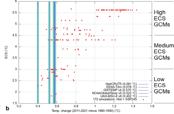 But even so, it’s clear from Fig. 4 (as it was in our figure in the initial complaint) that the in situ and reanalysis observations are consistent with having been drawn from many of the model ensembles in Scafetta’s medium and even high ECS groups.