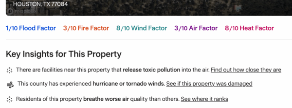 If you have been browsing Zillow or Redfin in recent years, you may have noticed that (in the US at least), listings have been accompanied by a property risk score for fire, flood, air quality, etc. These scores have mostly been generated by First Street – a private company that takes publically available information about climate risk, and downscales it to the lot level using a proprietary algorithm.