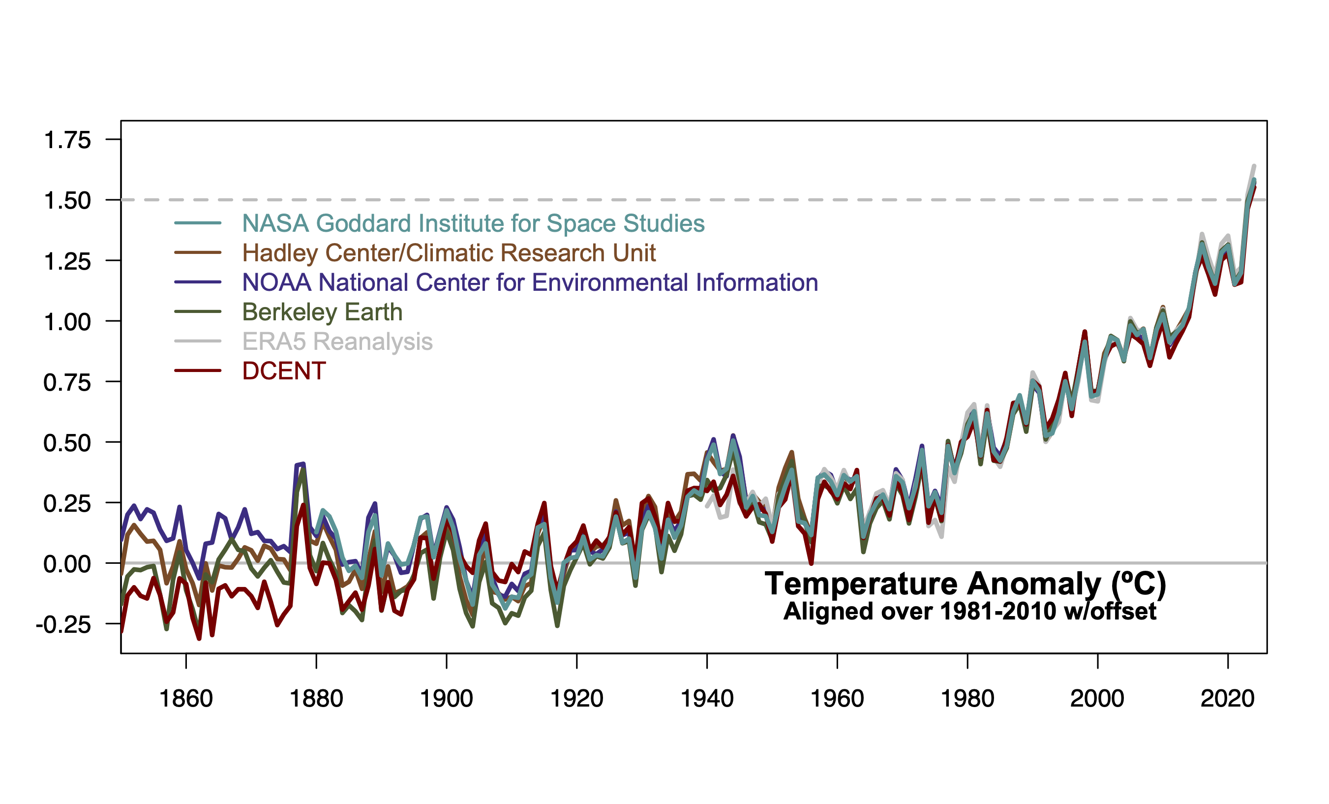 Last year was the first in which we “likely” exceeded 1.5ºC in the annual average (the WMO average was 1.55ºC), and the assessed uncertainty in this (arising from all the mentioned issues) is about ±0.13ºC (90% CI). With updates to the records, the WMO average would now be 1.54ºC. But if you added an offset to the 1981-2010 baselined data so that the average of the four long records was zero, 2024 would be at 1.58ºC. Adding an offset so that the WMO average was zero over the baseline takes you back to 1.54ºC.