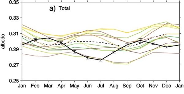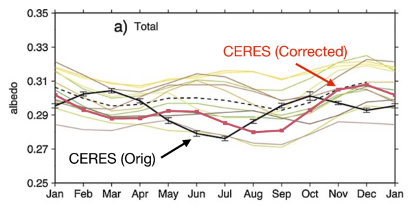 We can speculate about what led to this (possibly related to the first month with data being March 2000 assumed to be January?), but there are two immediate consequences. First, the CMIP5 models (like the CMIP6 and CMIP3 models) turn out not to be so bad: phasing is ok, but the annual mean albedo can be a little variable. Second, it’s likely that the other panels in Fig 11, Figs. 5a-c, the discussion about them in section 6 etc. in the Stephens et al (2015) are also affected by this. Despite citing Bender et al (2006), and also Kato (2009) (see his figure 1a) who have it correct, the phase offset was not addressed. The Stephens et al paper has since been cited over 240 times, and it seems odd that no-one else had noticed this issue [Aside, if you know of a reference that does make this point, please let me know in the comments].