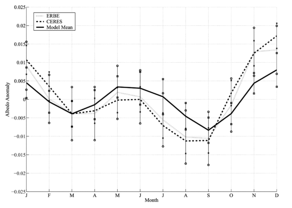 The CERES observations in the three plots do not agree at all! The 2015 figure has maximum albedo in March and October, while the other two have maxima in June and December – a 2 or 3 month phase shift. Something is wrong here. Fortunately, the CERES project has a very accessible website for downloading data, and it’s trivial to get the incoming solar flux and reflected solar flux for every month. The albedo is just the ratio, and we can average the months to create a climatology. The differences in the averaging periods makes no visible difference, and the differences in the EBAF version are likely to be minor (though that is harder to check). However, the bottom line is that the CERES data in the 2015 figure is wrong, while the 2006 and 2020 papers are correct.