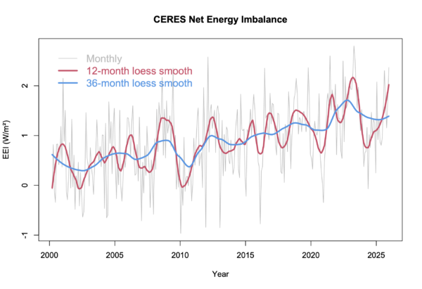 Interest in the EEI is obviously growing, both as a function of the increasing length of the CERES timeseries and the fact that the EEI is growing. Even the WMO is elevating this metric in importance. So one might expect the contrarian-sphere to try and undermine it – that’s just what they do.