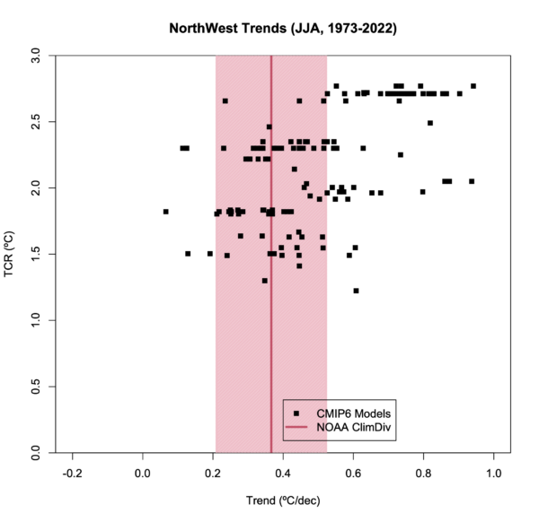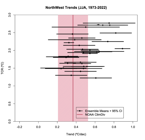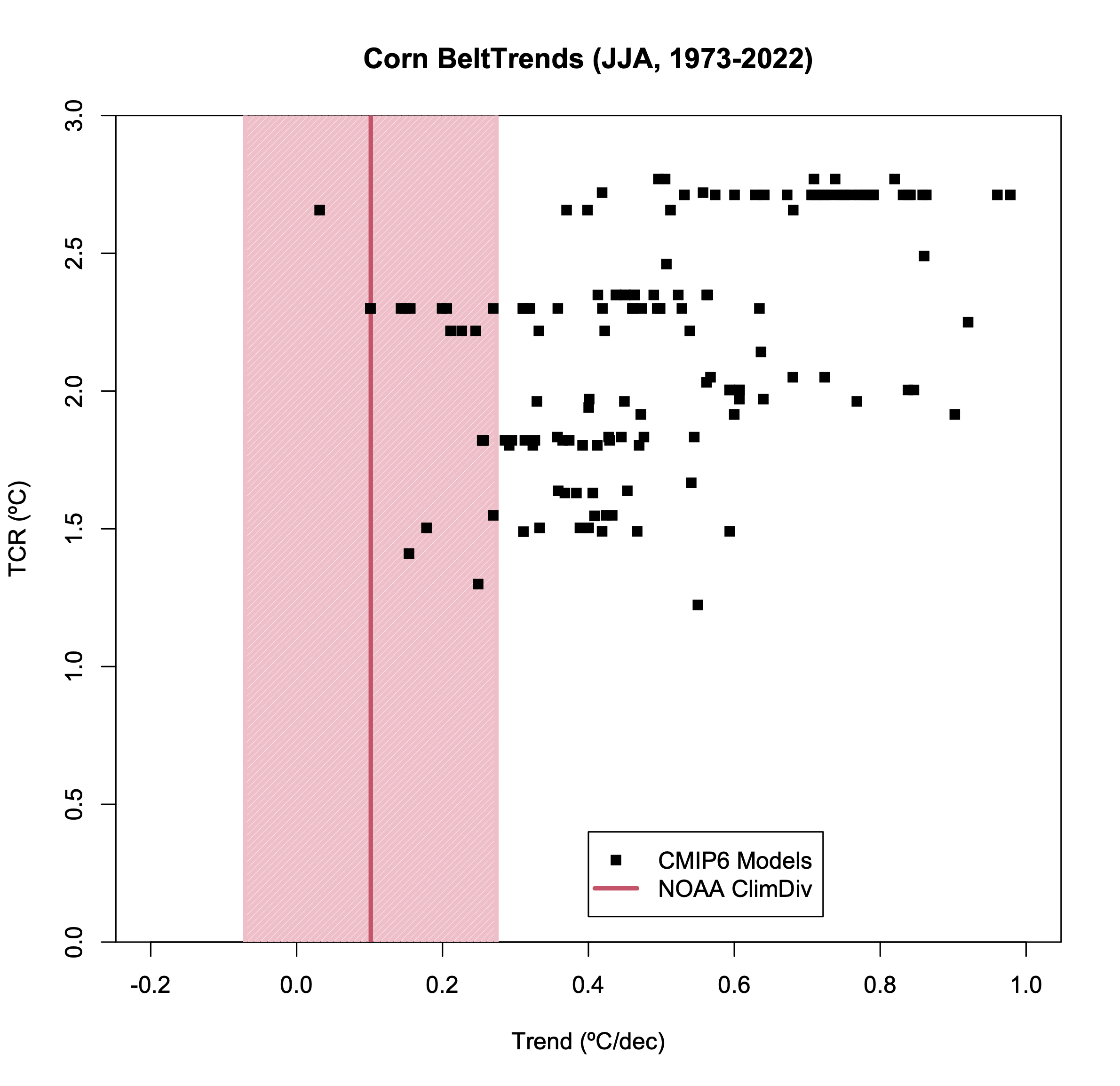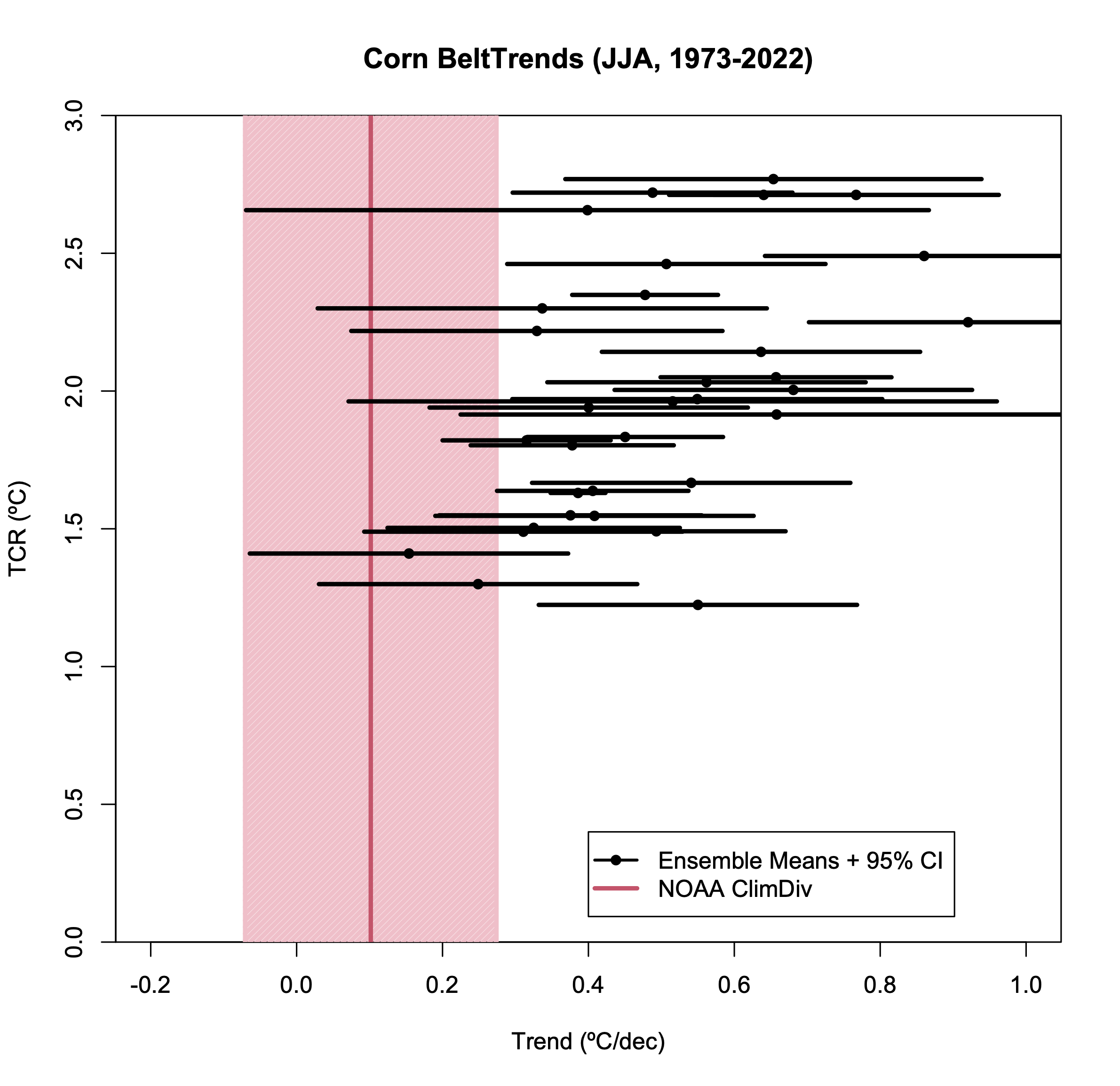 So let’s plot the JJA trends for the Corn Belt region, including two elements that Spencer ignored. First, the uncertainty in the OLS trend in the observations (which is large) and, second, the spread across the individual model ensembles. As we did previously, we can plot the trends against the climate sensitivity (here I’ll use the Transient Climate Response) to see the difference that the ‘hot models’ make (IPCC AR6 assessed that the likely range of TCR was 1.4-2.2ºC, very likely 1.2-2.4ºC). Note that noisier the statistic (short periods, small regions, etc.) the less clear any difference related to climate sensitivity will be.
