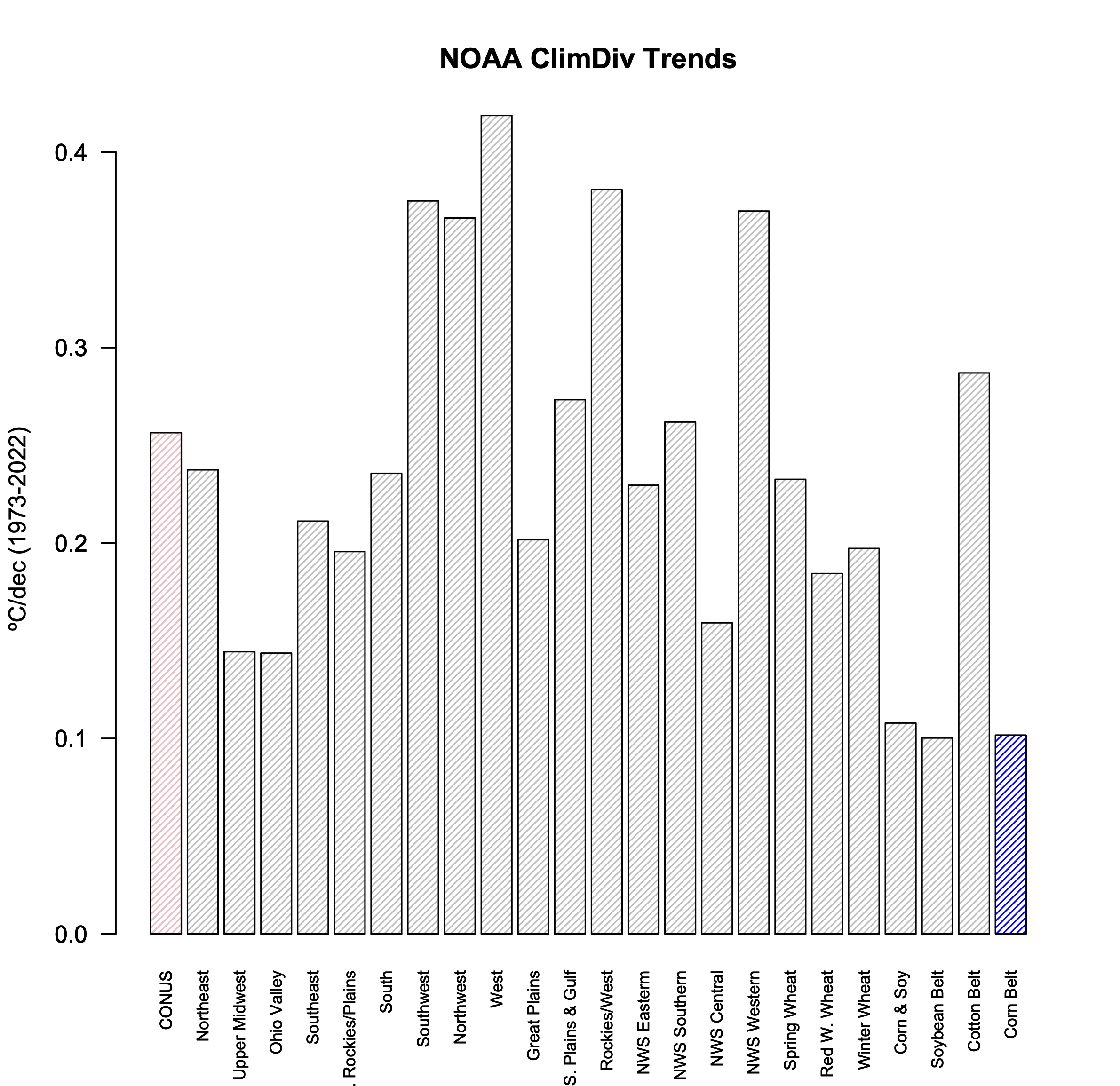 Spencer most likely used this precomputed index (across 11 states, though his figure says 12 – he might have tried making his own 12-state index but I don’t think it matters much, other than making it trickier to replicate). Anyway, the Corn Belt data (code 261 for the area weighted observational data) can be downloaded directly and the JJA trends computed for the 50 year period 1973-2022 (following Spencer’s graph). I’m sure it will come as a great shock to our readers that of all the regions computed in the NOAA ClimDiv dataset over this period, the Corn Belt index has almost the lowest summer trend (0.1ºC/dec though with a wide (95%) confidence interval [-0.07,0.27]). Quel surprise!