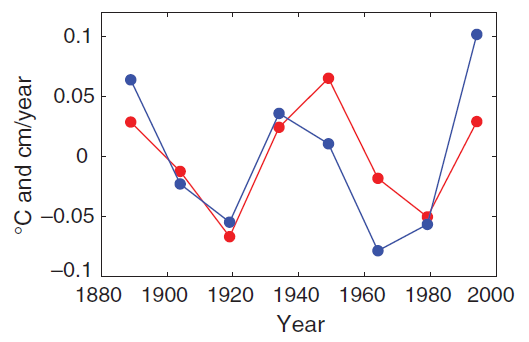 Fig. 1: Fifteen-year averages of the global mean temperature (blue, °C, GISS data) and rate of sea level rise (red, cm/year, Church&white data), both detrended.