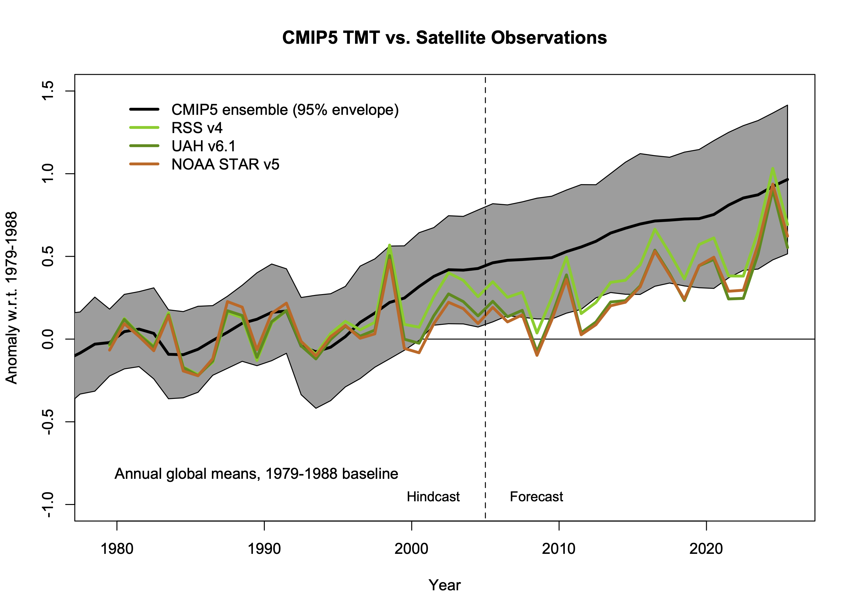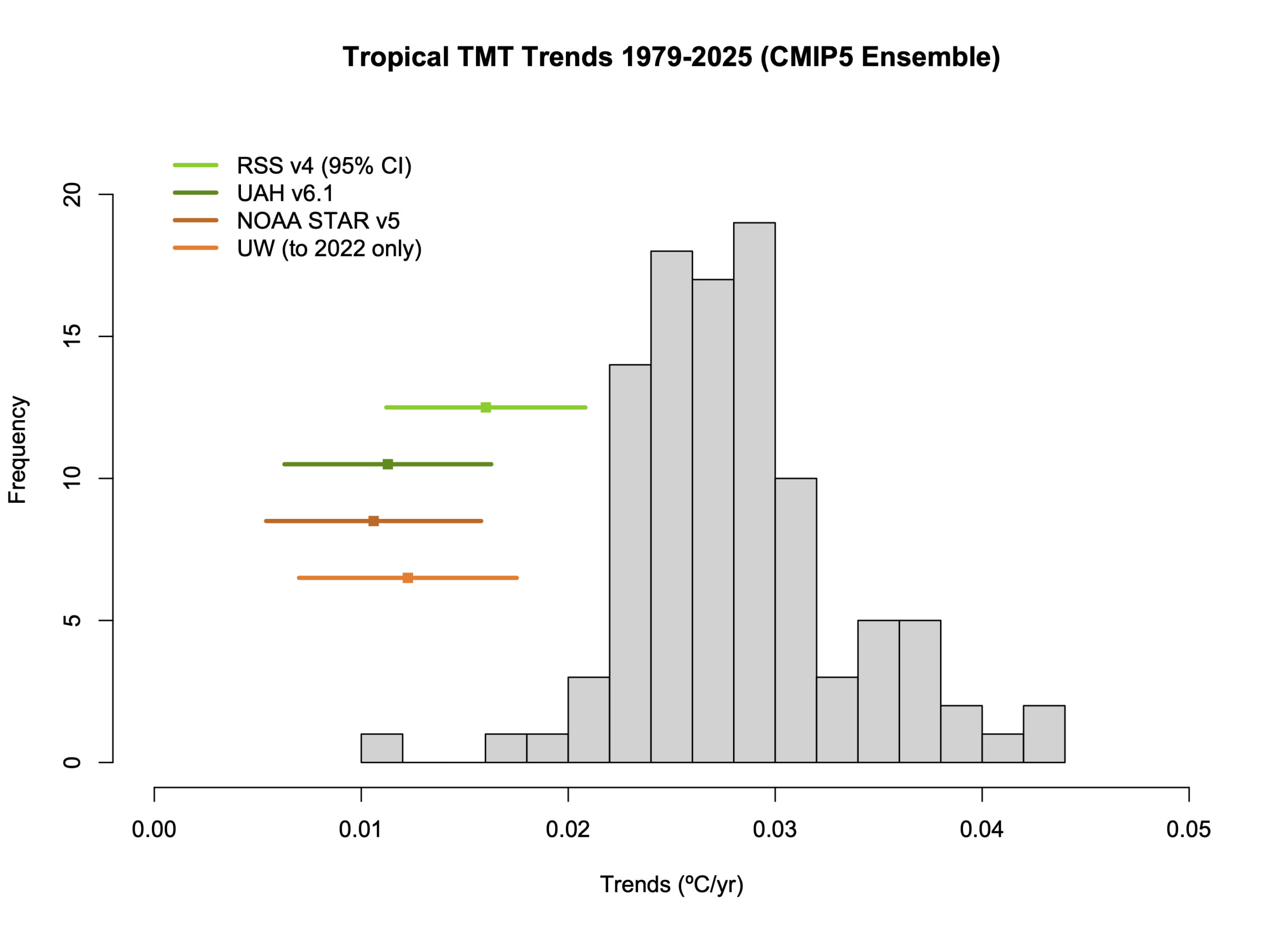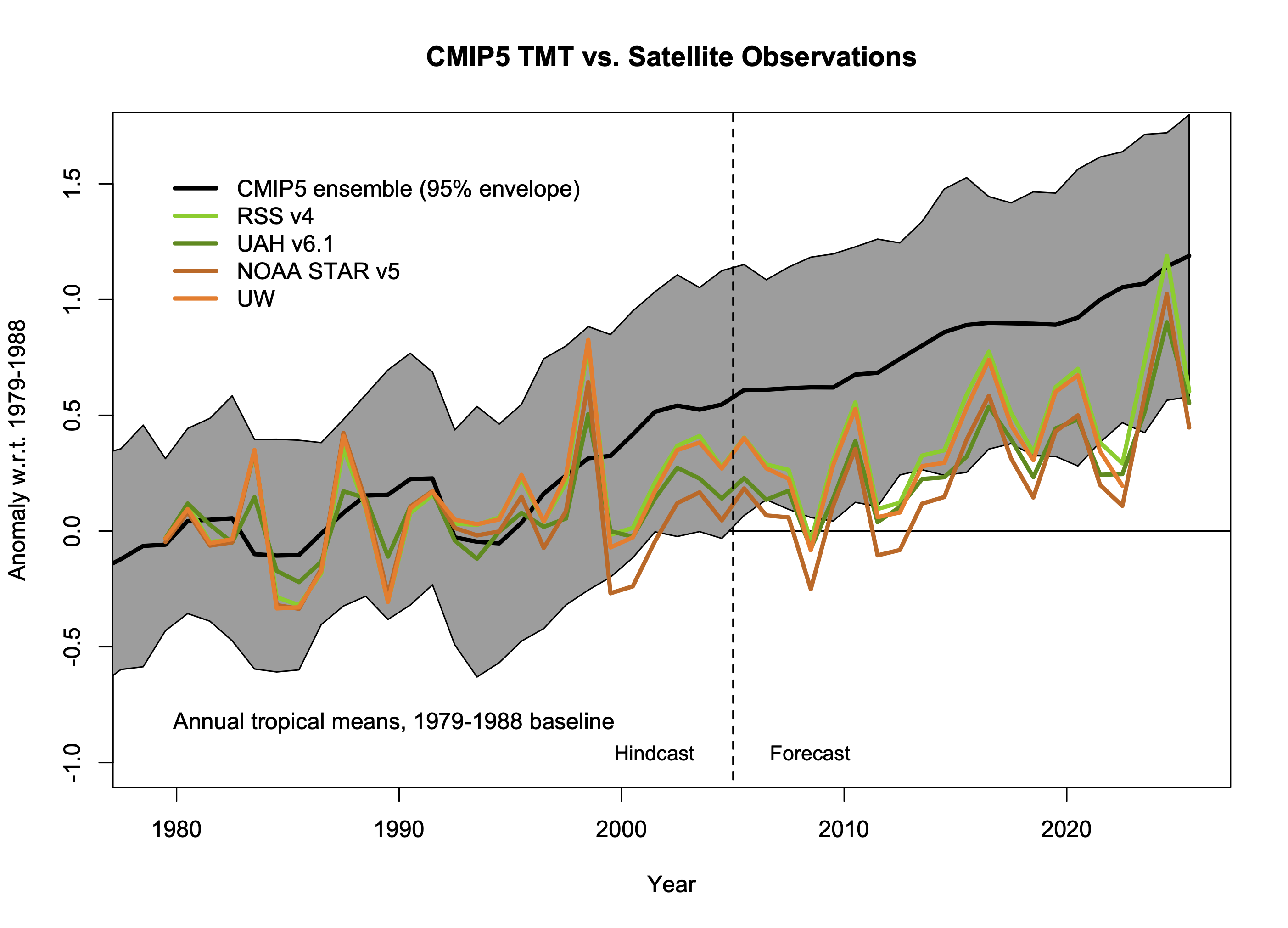 Original discussion (Jan 2017). Mid-troposphere satellite products from UAH, RSS, NOAA STAR and UW (Po-Chedley et al, “UW” tropical values only – updated to 2022 only). Model values use synthetic MSU/AMSU-TMT weightings, spread is 95% envelope of simulations, but this product only exists up to 2025, so these figures won’t be updated again. Last updated: 25 Jan 2026.
