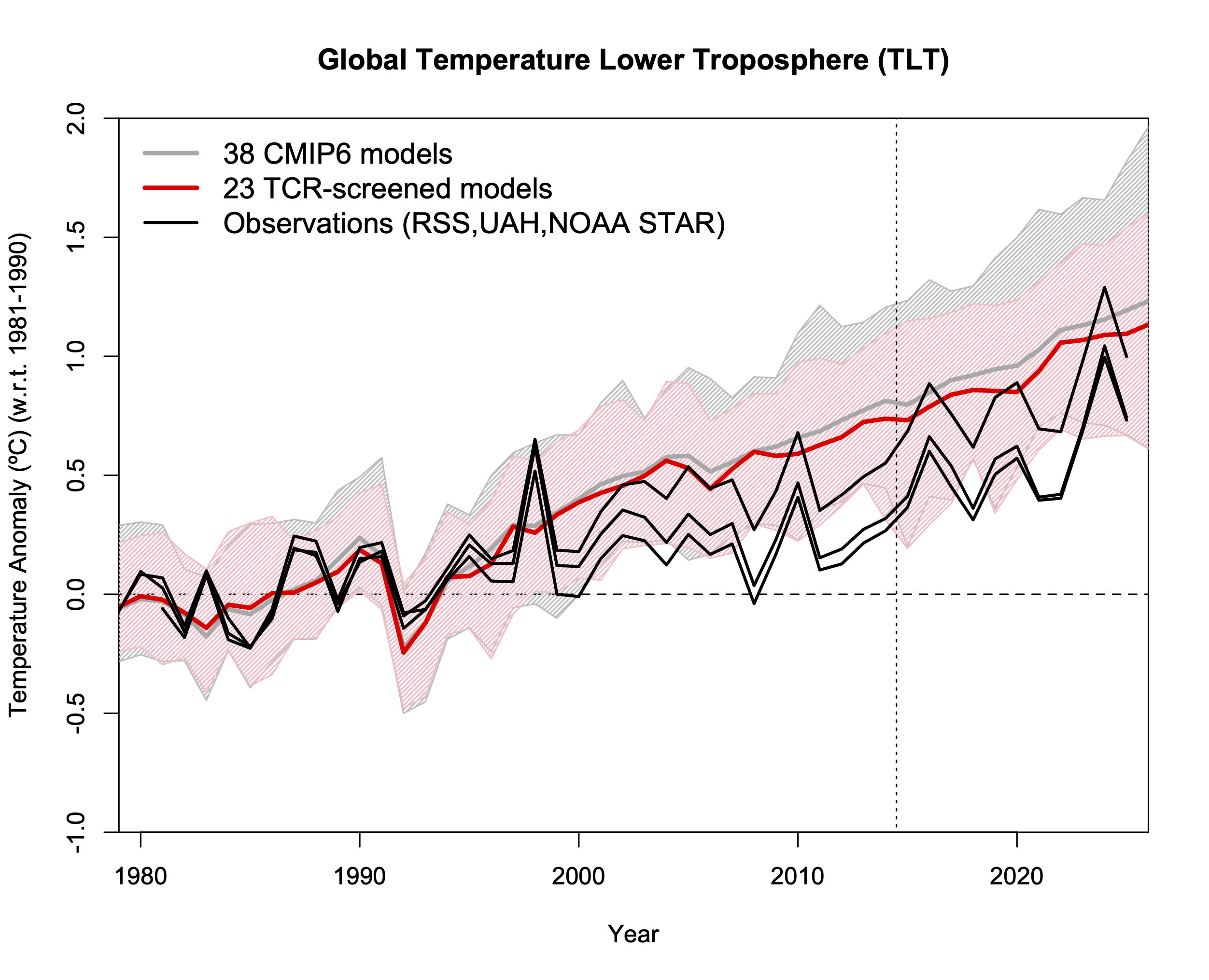 The Temperature of the Lower Troposphere (TLT) diagnostic in a 38-model subsample of the CMIP6 database (McKitrick and Christy, 2020) compared to RSS v4, UAH v6.1 and NOAA STAR v5. Plots includes the full ensemble, and then a subset of models that have a TCR within the IPCC AR6 likely range. Model values use synthetic TLT weightings, spread is 95% envelope of simulations. Last updated: 22 Jan 2026.