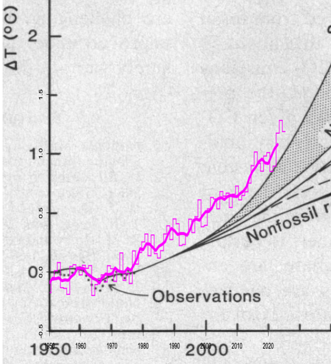 Original discussion (figure originally courtesy of Geert Jan van Oldenborgh, Hansen et al. (1981)). Observations are the GISTEMP LOTI annual figures and 5 year mean. Last updated: 27 Jan 2026.